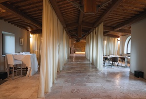 Il menù alla carta (che varia ogni 3-4 settimane) riserva piatti molto succulenti, tra questi il Coniglio in porchetta, sedano rapa e bitter Santoni e il Bottone di asparagi e ricotta di pecora Fattoria Pianporcino, fondo di verdure, trebbiano ed erbe spontanee. Accompagnano pane fatto in casa, olio autoprodotto, pre-dessert e piccola pasticceria. Il piatto appositamente firmato dallo chef include i Tortelli ripieni di formaggio guttus, mandorle, tartufo nero della Val d’Orcia e alchermes.