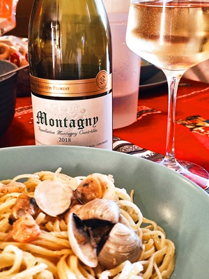 E allora si fa presto ad accompagnare al Montagny vin de Bourgogne una prima portata di tagliolini al sugo bianco di vongole, cozze e piccoli crostacei… ça va sans dire!