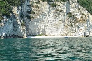 La Baia di Portonovo, detta anche Baia Verde per la preponderante presenza di vegetazione in virtù del soverchiante Parco del Conero, prolunga in segmenti di sassi e ghiaia bianca.