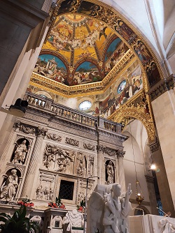 Una dimensione altra che riunisce opere somme, sculture, pitture, statue, altari e ambienti talmente ricchi da essere ardui da descrivere. Soltanto gli occhi risultano perciò in grado di immagazzinare e tradurre in sensazioni il fasto del santuario.