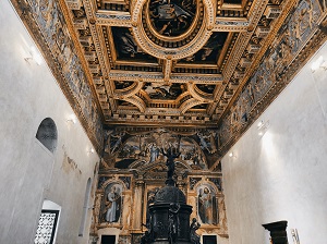 Di entrambi colpisce il soffitto, a cassettoni dipinti nel primo (una visione che lascia a bocca aperta!), a volte a crociera nel secondo.